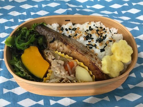 塩麹につけた豚ロースを焼いたものがメイン。 さっそくアボカドを持って行ってもらいます。 託児所のおやつでたまにおにぎりの日があるらしい。(食いしん坊の長男が夕飯でお米を全残しの日はだいたいそう) なので、主人のおやつにも、と、おにぎりをお弁当…